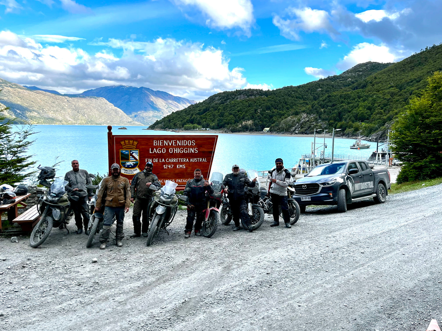 This will be a day you will never forget!! We will ride between mountains, rivers, cliffs and lush forests, we will arrive at Puerto Yungay where we will wait for the ferry that will transport us to Río Bravo to continue our trip to Villa O'Higgins. From there, just kilometers away we will find Bahamondes Bay and a sign that tells us that it is the End of Carretera Austral. After the obligatory photo and happy to have achieved the goal, we headed to Villa O'Higgins where a roast lamb dinner awaits us to celebrate this important milestone.